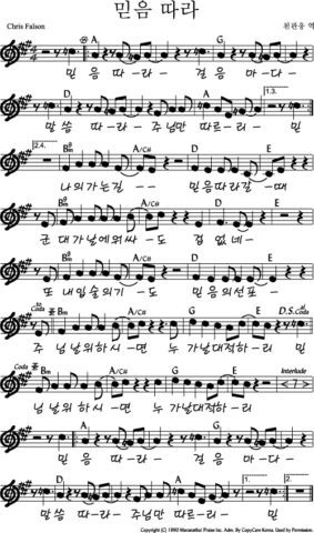 위에서 제공된 “믿음 따라” 악보를 참고하여, 믿음으로 주님의 말씀을 따라 나아가는 시간을 가지세요. 주님께서 우리를 인도하시며, 그분의 말씀을 따르는 삶이 우리에게 진정한 기쁨과 평안을 줄 것입니다.